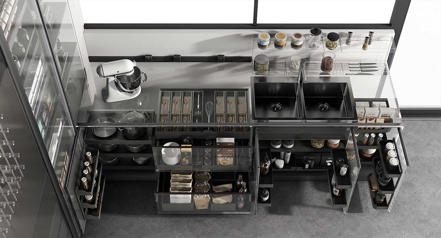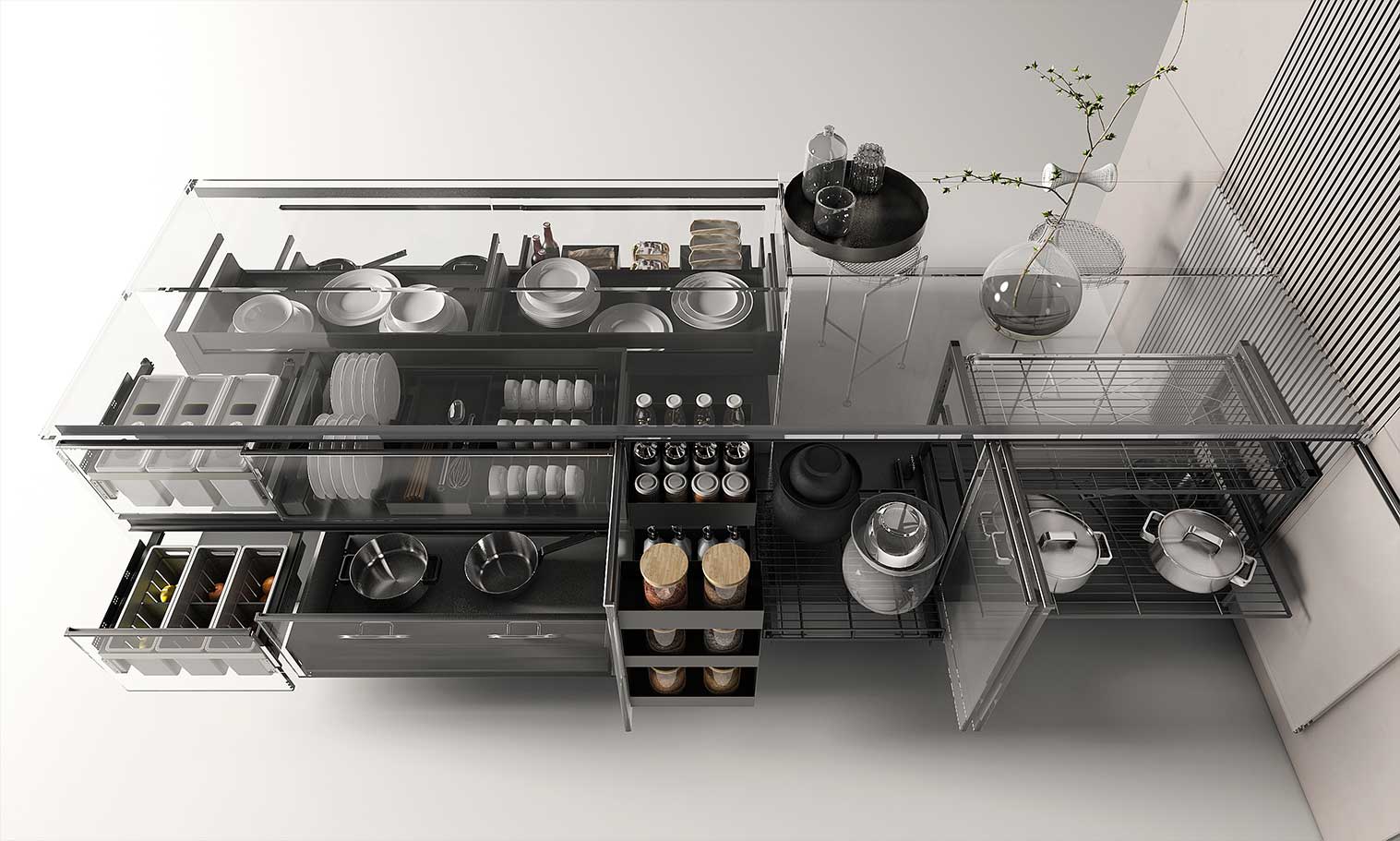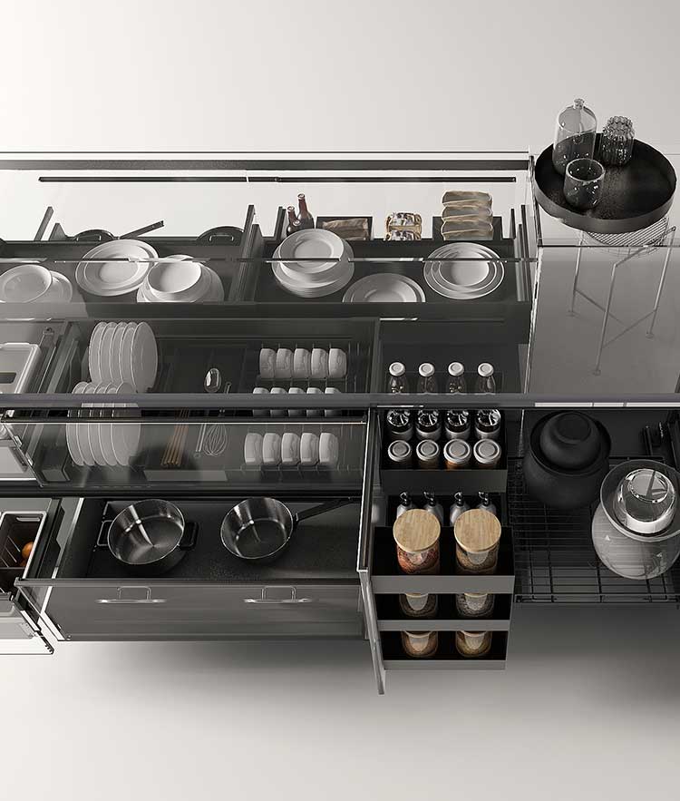 根据餐厨用具的尺寸、重量、材质、使用频率以及操作区间进行设计,让中式碗筷,西式刀叉,对号入座。